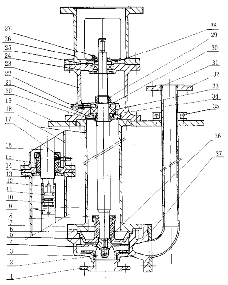 1、 泵體    2、葉輪螺母    3、葉輪    4、墊片    5、泵蓋    6、立柱管    7、導(dǎo)軸管    8、導(dǎo)軸承蓋    9、泵軸    10、傳動套    11、聯(lián)接管    12、鍵    13、中間導(dǎo)軸承壓蓋    14、中間導(dǎo)軸承座    15、中間導(dǎo)軸承    16、泵軸    17、潤滑液管路    18、立柱管    19、支承座    20、甩液套    21、下軸承壓蓋    22、黃油杯    23、軸承座    24、上軸承檔圖    25、軸承    26、電機座    27、黃油杯    28、上軸承壓蓋    29、鎖緊螺母    30、下軸承擋圈    31、出液管    32、出液口法蘭    33、軸承    34、油封    35、對半法蘭    36、鍵    37、墊片    38、下軸承壓蓋