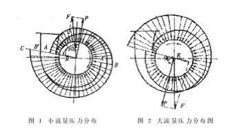 (2)當(dāng)流量小于設(shè)計工況流量時,可從圖1看出,由于撞擊而產(chǎn)生的徑向力 P 的方向應(yīng)當(dāng)指向離隔舌,并向渦殼中液流的同方向轉(zhuǎn) 90°的方向,這一點(diǎn)極易證明。圖1上沿圓周壓強(qiáng)分布線 ABC 是一條上升值與角度成正比的螺旋線。在離隔舌180°的地方開始,做一條與之相同的螺旋線 A′B′,則把隔舌從 180°到 360°之間的壓強(qiáng)分成兩段,即與AB 完全一樣的 A′B 部分和 A′BCB′ 部分。AB 部分引起的徑向力與 A′B′ 部分引起的徑向力正好抵消,而 A′BCB′的剩余壓強(qiáng)大小均相等。因此,徑向力 P 的方向應(yīng)當(dāng)向上,即指向離隔舌90°的方向。同樣,當(dāng)流量大于設(shè)計流量時,這部分的徑向力 P 應(yīng)當(dāng)是指向下方,即指向從隔舌開始 270°的地方。這就是徑向力產(chǎn)生的主要原因!