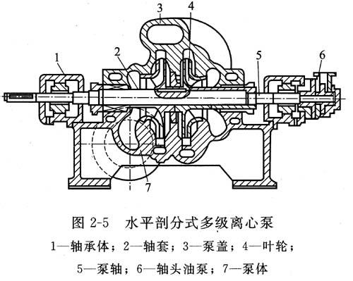 圖2—5所示為水平剖分式多級離心泵結(jié)構(gòu)。這種泵采用蝸殼形泵體,每個(gè)葉輪的外圍都有相應(yīng)的蝸殼,相當(dāng)于將幾個(gè)單級蝸殼泵裝在同一根軸上串聯(lián)工作,所以又叫蝸殼式多級泵。由于泵體是水平剖分式,吸人口和排出臥都直接鑄在泵體上,檢修時(shí)很方便,只需