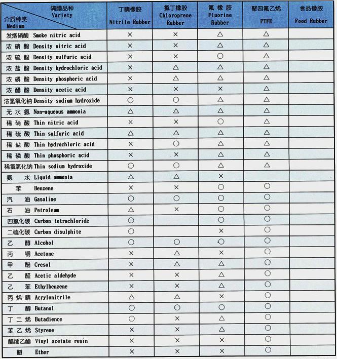 注:○——表示壽命較長;△——表示壽命一般;×——表示不可用。本表僅從耐腐性考慮,因聚四氟乙烯彈性比橡膠差,所以實際使用壽命因壓力,隔膜泵、行程、雜質(zhì)等因素影響而異。食品橡膠專用于食品飲料行業(yè)。
