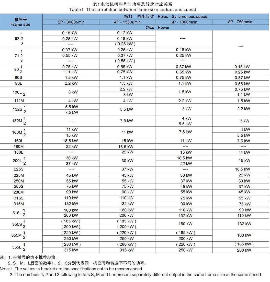 | 【技術(shù)數(shù)據(jù)】 1、電機機座號與功率及轉(zhuǎn)速對應(yīng)關(guān)系 2、電機電氣性能參數(shù)(在建中...) 3、安裝結(jié)構(gòu)型式 4、安裝及外形尺寸 5、額定電壓為三相380V,也可定制成其他特殊電壓:三相110V-1140V或雙電壓。 6、額定頻率為50Hz,也可定制成60Hz。 7、工作制:S1。 8、變頻范圍:5-60Hz(2P)、5-100Hz(4P及以上)。 9、其他特殊要求:可按要求增加PTC熱敏電阻、定制雙伸軸或齒輪減速機專用(工字型)等特殊尺寸。 |