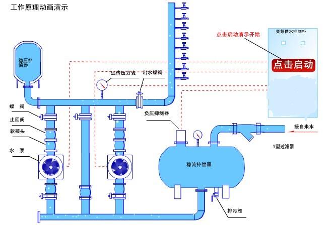 2.變頻泵的進水口與不銹鋼穩(wěn)流補償器相連,微機系統(tǒng)檢查穩(wěn)流補償器內(nèi)的壓力,當(dāng)壓力降到零壓時,安裝在穩(wěn)流補償器內(nèi)上方外部的真空自動抑制器就會自動打開穩(wěn)流補償器內(nèi)外空氣通道開通,通過進水壓力檢測和真空自動抑制器來保證穩(wěn)流補償器內(nèi)不產(chǎn)生負壓,從而保證自來水管網(wǎng)的正常供水。