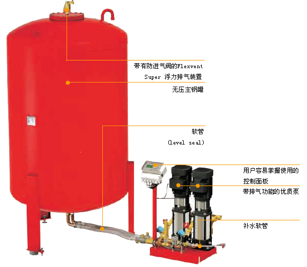 囊式膨脹定壓罐主要罐體、供水膠囊、進(出)水口、充氣裝置、壓力表、排氣閥等組成。供水膠囊采用純天然無毒橡膠制成,具有良好的韌性和伸縮性能,它與進水口相通,并且形成一個密閉的腔室將水與外部鋼罐內壁完全隔絕,膠囊和鋼罐內壁之間充有氮氣,具有很強的化學惰性及比熱容大等優(yōu)點。囊式定壓罐主要利用氣體的可壓縮性,對系統(tǒng)由于溫度變化引起的水體積增大或減少進行吸納或補充作用。當系統(tǒng)溫度增高時,水體積增大,這時系統(tǒng)壓力大于罐內氣體壓力,部分水會被壓入罐內的膠囊里,直到罐內氣體的壓力與系統(tǒng)壓力達到平衡。當系統(tǒng)溫度降低時,水體積變小,這時罐內氣體壓力大于系統(tǒng)壓力,部分水會被壓回系統(tǒng),起到對系統(tǒng)補充水量的作用。囊式定壓罐通常與外部的控制箱,補水泵及電接點壓力表等,連接形成機組,根據(jù)系統(tǒng)的低需要壓力及高運行工作壓力設定工作狀態(tài),性能特點和應用范圍