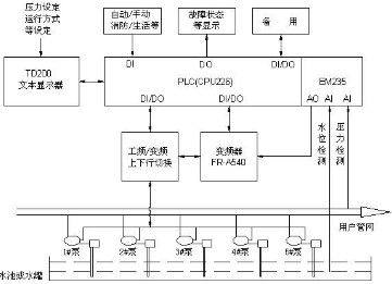 該系統(tǒng)由四臺(tái)大泵(22KW)與一臺(tái)小泵(5.5KW)組成;PLC部分由西門子可編程控制器S7-200系列的CPU226,文本顯示器TD200組成;變頻器采用三菱FR-A540系列,功率22KW。