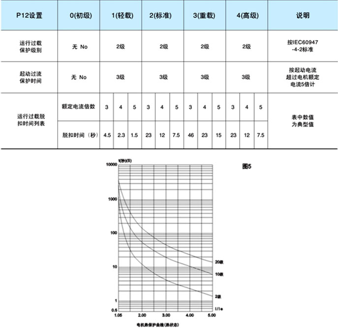 ◆ 輕載、標準、重載三個保護級別具備完全的保護功能,區(qū)別在于電機過載熱保護時間曲