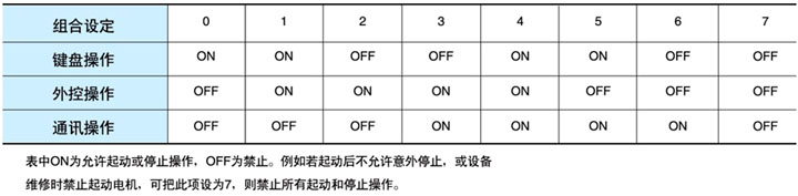 ■ 7種組合控制方式:為了更靈活方便地對軟起動器進行起動和停止操作,設(shè)置了7種不同的操作組合方式供用戶根據(jù)需要進行選擇,設(shè)置項FD組合方式如表2: