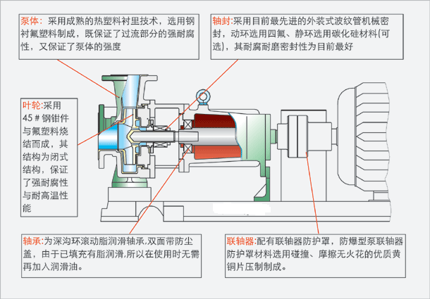 IHF氟塑料離心泵是按國際標(biāo)準(zhǔn)并結(jié)合非金屬泵的工藝設(shè)計制造。泵體采用金屬外殼內(nèi)襯聚全氟乙丙烯(F46),泵蓋、葉輪和軸套均用金屬嵌件外包氟塑料整體燒結(jié)壓制而成,軸封采用外裝式先進的波紋管機械密封,靜環(huán)選用99.9%氧化鋁陶瓷(或氮化硅),動環(huán)采用四氟填充材料,其耐腐耐磨密封性極好。泵的進出口均采用鑄鋼體加固,以增強了泵的耐壓性。實際使用顯示,該泵具有耐腐、耐磨、耐高溫、不老化、機械強度高、運轉(zhuǎn)平穩(wěn)、結(jié)構(gòu)先進合理、密封性能嚴(yán)格可靠、拆卸檢修方便、使用壽命長等優(yōu)點。