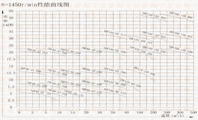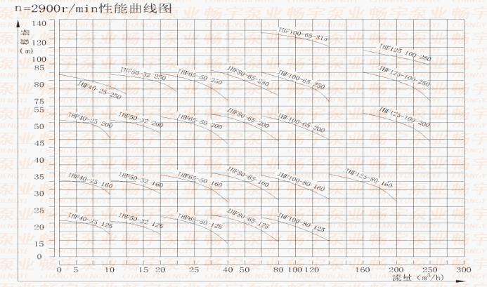 三、IHF氟塑料離心泵產(chǎn)品性能參數(shù): 型號 轉(zhuǎn)速(Rev)=2900r/min 介質(zhì)密度=1000kg/m3 轉(zhuǎn)速(Rev)=1450r/min 介質(zhì)密度=1000kg/m3 流量 揚程 電機功率kw 汽蝕余量m 效率 整機 流量 揚程 電機功率kw 汽蝕余量 效 率 整機 IHF40-25-125 4 21 1.5 2.0 40 90 2 5.5 0.55 2.0 34 80 6.3 20 3.2 5 10 18 4 3 IHF40-25-160 4 33 2.2 2.0 33 100 2 9 0.55 2.0 27 80 6.3 32 3.2 8 10 28 4 6 IHF40-25-200 4 51 4 2.0 26 140 2 13 0.75 2.0 20 80 6.3 50 3.2 12.5 10 47 4 10 IHF40-25-250 4 81 7.5 2.0 25 195 2 20.5 1.5 2.0 19 80 6.3 80 3.2 20 10 78 4 19.5 IHF50-32-125 7 22 2.2 3.0 51 105 4 5.5 0.55 3.0 45 80 12.5 20 6.3 5 15 16 8 3.5 IHF50-32-160 7 33 4 3.0 46 120 4 9 0.55 3.0 40 80 12.5 32 6.3 8 15 30 8 6 IHF50-32-200 7 51 7.5 3.0 39 170 4 13 1.1 3.0 33 92 12.5 50 6.3 12.5 15 47 8 10 IHF50-32-250 7 82 11 5.0 35 225 3.5 21 1.5 5.0 30 102 12.5 80 6.3 20 15 78 7 18 IHF65-50-125 15 22 3 3.5 62 110 8 5.5 0.55 3.5 55 80 25 20 12.5 5 35 18 15 3 IHF65-50-160 15 33 5.5 3.5 57 135 8 9 1.1 3.5 51 92 25 32 12.5 8 35 28 15 6 IHF65-40-200 15 51 11 3.5 52 210 8 13 1.5 3.5 46 110 25 50 12.5 12.5 35 45 15 10 IHF65-40-250 15 82 18.5 3.5 50 360 8 21 3 3.5 43 140 25 80 12.5 20 35 72 15 18 IHF80-65-125 35 22 5.5 4.0 69 155 16 5.5 1.1 4.0 64 110 50 20 25 5 60 18 35 3 IHF80-65-160 35 33 11 4.0 67 160 16 9 1.5 4.0 62 110 50 32 25 8 60 27 35 6 IHF80-50-200 35 52 15 4.0 63 240 16 13 2.2 4.0 57 120 50 50 25 12.5 60 45 35 10 IHF80-50-250 35 82 30 4.0 56 250 16 21 5.5 4.0 51 140 50 80 25 20 60 75 35 18 IHF100-80-125 65 22 11 4.5 77 230 35 5.5 1.5 4.5 74 130 100 20 50 5 120 18 60 3 IHF100-80-160 65 35 15 4.5 73 280 35 8.5 2.2 4.5 69 140 100 32 50 8 120 26 60 6 IHF100-65-200 65 51 30 4.5 73 420 35 13 5.5 4.5 68 320 100 50 50 12.5 120 43 60 10 IHF100-65-250 65 82 45 4.5 71 560 32.5 20.5 11 4.5 66 350 100 80 50 20 120 65 60 16.3 IHF125-100-160 100 38 30 5.0 70 440 50 10 5.5 5.0 74 300 160 32 80 8 180 26 90 6 IHF125-100-200 120 55 55 5.0 65 660 65 13 11 5.0 71 600 200 50 100 12.5 220 45 120 10 IHF125-100-250 65 21 15 5.0 72 620 100 20 120 18 IHF125-100-315 65 36 18.5 3.0 60 620 100 32 120 30 IHF150-125-250 130 22 22 7.0 67 700 200 20 240 18 IHF150-125-315 120 36 45 5.0 73 780 200 32 240 30 IHF150-125-400 120 55 75 7.0 75 920 200 50 400 46 IHF200-150-250 240 22 55 6.0 83 760 400 20 480 17 IHF200-150-315 240 36 75 7.5 75 840 400 32 480 29 IHF200-150-400 240 55 110 7.5 63 960 400 50 480 46 五、IHF氟塑料離心泵性能曲線 IHF氟塑料離心泵泵進口口徑<150mm: 1)關(guān)閉電源、進出口閥門,松開底腳螺栓;拆開防護罩將電機和泵頭聯(lián)軸器分開。 2)松開支架與泵體的連接螺栓、懸支架螺栓?蓪⑷~輪、泵蓋、支架、軸承箱、機械密封從泵體上一并拆開。 3)松開泵軸端的緊固螺母,用銅棒敲擊螺母和拉緊螺栓,使葉輪的尾錐與泵軸上的錐套分開,葉輪、泵蓋、機械密封、支架、軸承箱各自分離。 4)松開機械密封動環(huán)的兩只緊固螺釘,可以從葉輪上退下機械密封動環(huán),在取下泵蓋,卸下泵蓋上的機械密壓蓋螺釘,可以從泵蓋上取下機械密封的靜環(huán)。 5)如需要更換泵體,則要拆下進出口管道的聯(lián)結(jié)螺栓和泵體的地腳螺栓 6)更換葉輪時,要卸下尾錐上的圓螺母。 IHF氟塑料離心泵進口口徑≥150mm: 1)關(guān)閉電源、進出口閥門,松開底腳螺栓;拆開防護罩將電機和泵頭聯(lián)軸器分開。 2)松開支架與泵體的連接螺栓、懸支架螺栓?蓪⑷~輪、泵蓋、支架、軸承箱、機械密封從泵體上一并拆開。 3)直接取下裝有機械密封動環(huán)軸套,如有銹跡難卸,可利用軸上的反螺紋圓螺母旋下軸套。 4)松開機械密封壓蓋螺栓,可取下機械密封靜環(huán):松開機械密封動環(huán)的兩只緊固螺釘,可以從軸套上退下機械密封動環(huán)。 5)更換泵體,則要拆下進出口管道的聯(lián)結(jié)螺栓和泵體的地腳螺栓。