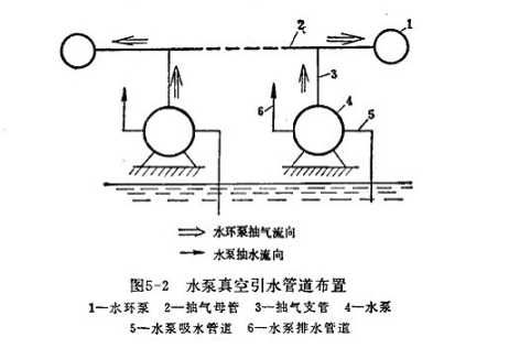 如果泵站中有兩臺(tái)以上的水泵,則可將水環(huán)式真空泵進(jìn)氣管與抽氣母管相通,每臺(tái)泵的泵殼頂部通過(guò)抽氣支管與抽氣母管相連。在每個(gè)支管上都安裝一個(gè)閥門,以便可以單獨(dú)對(duì)每一臺(tái)泵抽氣。有時(shí),為了備用起見(jiàn),可以設(shè)置兩臺(tái)水環(huán)式真空泵,每一臺(tái)的進(jìn)氣管上都安上閥門。當(dāng)一臺(tái)發(fā)生故障時(shí),可以關(guān)閉該泵上的進(jìn)氣閥門,利用另外一臺(tái)抽氣,不致耽誤水泵的起動(dòng)。正常情況下兩臺(tái)水環(huán)式真空泵可對(duì)水泵同時(shí)抽氣,以加快引水速度。整個(gè)管路布置如圖5-2所示。