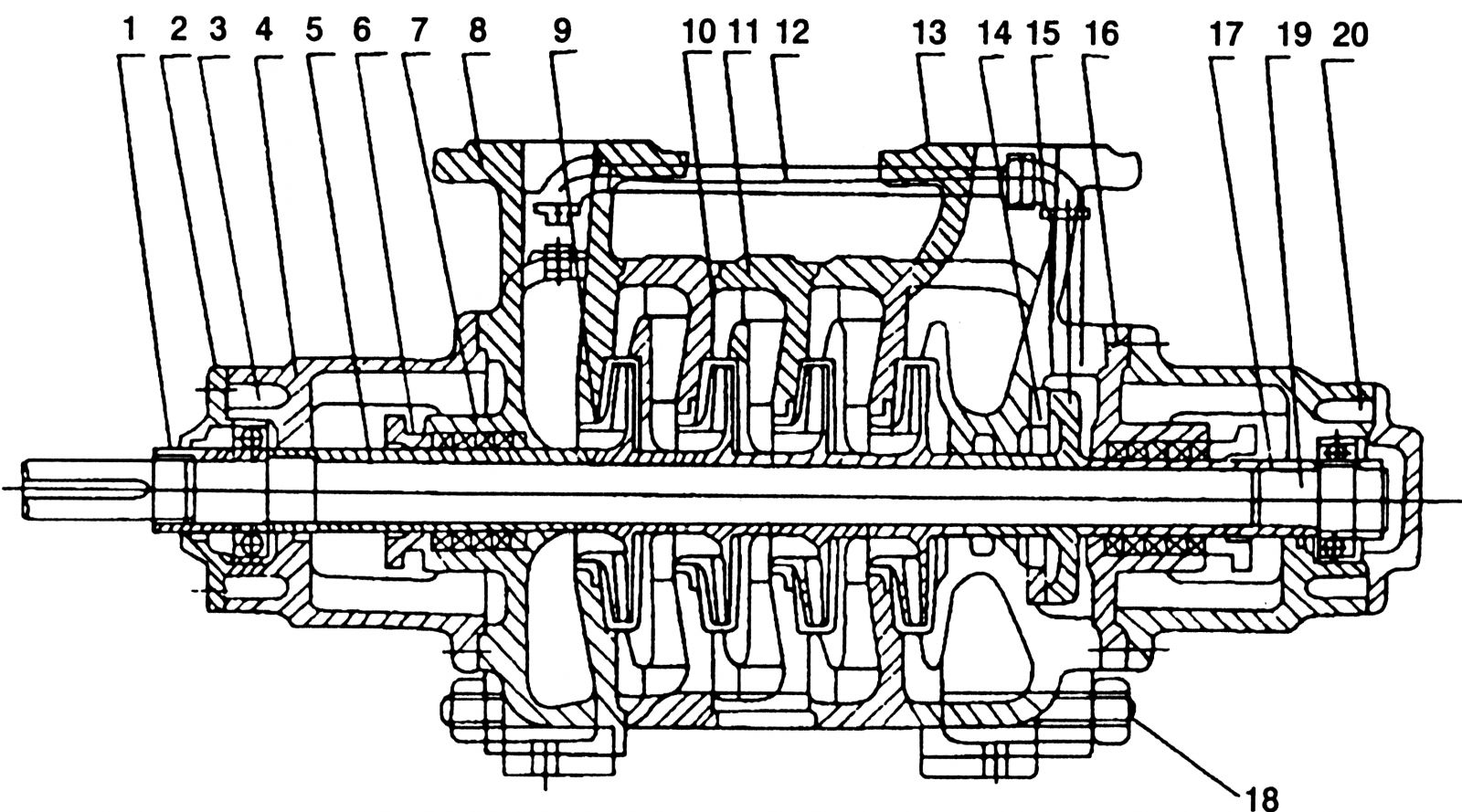 GC型水泵的主要零件有軸、軸套、進(jìn)水段、葉輪、導(dǎo)翼、密封環(huán)、中段、出水段、平衡環(huán)、平衡盤、尾蓋。
