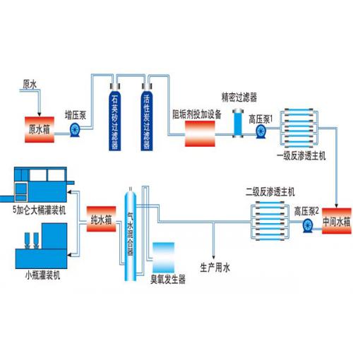 原水不銹鋼CDLF多級離心泵加壓泵-多介質(zhì)過濾器-活性炭過濾器-軟水器-保安過濾器-第一級反滲透機-第二級反滲透機-儲水罐-純水輸送不銹鋼CDLF多級離心泵-用水點。