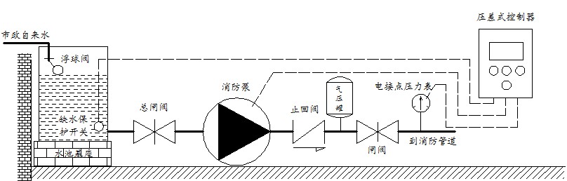 臨時(shí)消防供水和臨時(shí)生產(chǎn)建設(shè)供水不一樣,一次性增壓,無需水泵頻繁啟動(dòng)便可以保證水壓恒定在某一范圍。消防是為了確保萬一有事故發(fā)生時(shí)有足夠流量的水和水壓。臨時(shí)消防增壓供水無需采用變頻控制,只需要采用氣壓式(也等同上面所說的壓差式)控制即可完美解決問題。如下圖是臨時(shí)消防供水增壓系統(tǒng)原理圖。