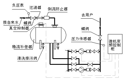 無負壓管網(wǎng)增壓穩(wěn)流給水系統(tǒng)工作原理圖