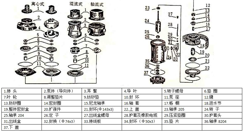 QY泵由水泵,密封和電動機(jī)三部分組成,水泵位于電泵上部,為離心式或軸流式結(jié)構(gòu)。電動機(jī)位于電泵下部為充油式三相異步電動機(jī),QY泵與電動機(jī)之間采用內(nèi)裝式整體機(jī)械密封盒密封,各固定止口密封處采用“O”形耐油橡膠密封圈作靜密封。