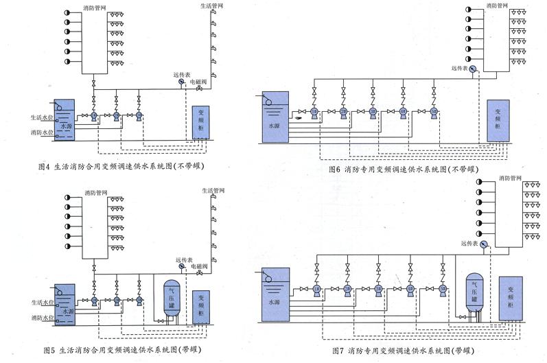 變頻供水成套設(shè)備:主泵組 變頻供水控制系統(tǒng);系統(tǒng)正常運(yùn)行時(shí),用戶用水管網(wǎng)上的壓力傳感器對(duì)用戶水壓進(jìn)行數(shù)據(jù)采樣,并將壓力信號(hào)轉(zhuǎn)換為電信號(hào),傳輸至PID調(diào)節(jié)器,然后與用戶設(shè)定的壓力值進(jìn)行比較和運(yùn)算, 并將比較和運(yùn)算的結(jié)果轉(zhuǎn)換為頻率調(diào)節(jié)信號(hào)和水泵啟動(dòng)臺(tái)數(shù)信號(hào)送至變頻器;變頻器據(jù)以調(diào)節(jié)水泵電機(jī)的電源頻率,進(jìn)而調(diào)整水泵轉(zhuǎn)速;可編程控制器根據(jù)PID調(diào)節(jié)器傳輸過來的水泵啟動(dòng)臺(tái)數(shù)信號(hào)控制水泵的運(yùn)轉(zhuǎn)。 通過對(duì)水泵的啟動(dòng)和停止臺(tái)數(shù)及其中變頻泵轉(zhuǎn)速的調(diào)節(jié),將用戶管網(wǎng)中的水壓穩(wěn)定于用戶預(yù)先設(shè)定的壓力值,使供水泵組“提升”的水量與用戶管網(wǎng)不斷變化的用水量保持一致,達(dá)到“變量恒壓供水”的目的.