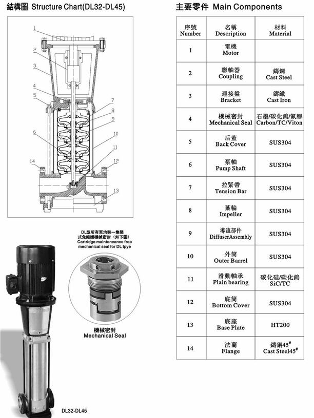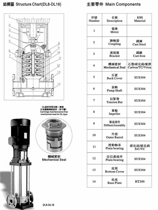 泵殼、葉輪、后蓋、泵軸及導(dǎo)流部件:SUS304或 SUS316L