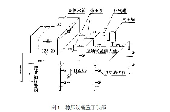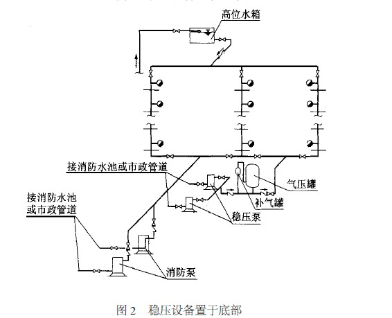 當(dāng)建筑物頂部有消防水箱,但放置穩(wěn)壓設(shè)備有困難時,多層建筑經(jīng)常將穩(wěn)壓設(shè)備放在首層或地下室內(nèi),如圖2 所示。高層建筑由于高位消防水箱距地面高差較大,若將穩(wěn)壓設(shè)備放在首層或地下室時,系統(tǒng)的工作壓力較大,可能引起系統(tǒng)超壓(超過管道的允許使用壓力) ,故推薦采用放在建筑物頂部的方案。