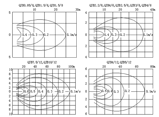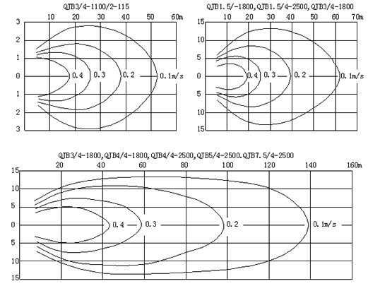 潛水?dāng)嚢铏C(jī)的選型是一項(xiàng)比較復(fù)雜的工作,選型的正確與否直接影響設(shè)備的正常使用,作為選型的原則就是要讓潛水?dāng)嚢铏C(jī)在適合的容積里發(fā)揮充分的攪拌功能,一般可用流速來確定。根據(jù)污水處理廠不同的工藝要求,潛水?dāng)嚢铏C(jī)佳流速應(yīng)保證在0.15~0.3m/s之間,如果低于0.15m/s的流速則達(dá)不到推流攪拌效果,超過0.3m/s的流速則會影響工藝效果且造成浪費(fèi)。所以在選型前首先確定QJB潛水?dāng)嚢铏C(jī)運(yùn)用的場所,如:污水池、污泥池、生化池;其次是介質(zhì)的參數(shù),如:懸浮物含量、粘度、溫度、PH值;還有水池的形狀、水深甚至安裝方式等都對選型產(chǎn)生影響,同時(shí)還應(yīng)考慮到節(jié)能因素,因?yàn)檫@將影響到用戶今后的運(yùn)行成本?蓞⒖枷旅娴臐撍?dāng)嚢铏C(jī)流場圖。